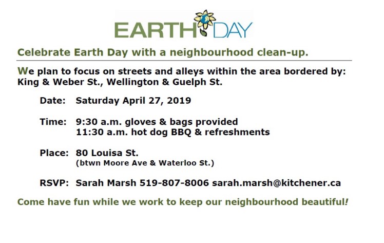 In between your market run and a your visit to the KW Library of Things event this morning, drop in to 80 Louisa Street for some Earth Day clean up activities and a BBQ lunch. (Sorry for the short notice.)