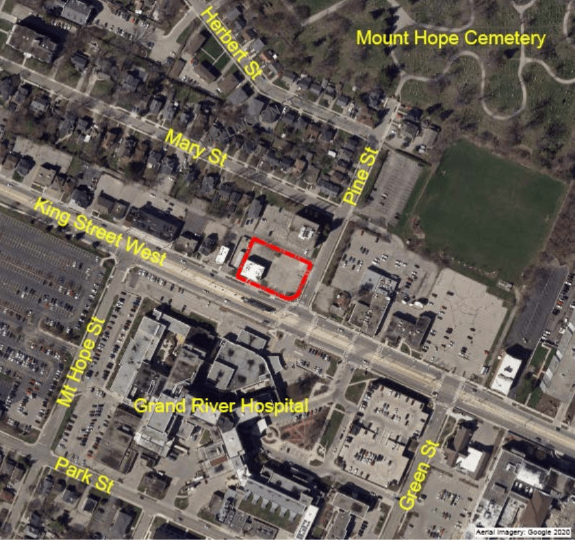 northwest corner of King Street West and Pine Street. The property is located directly across from the