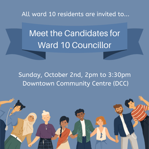 Mark your calendar for the next Municipal Election – Monday October 24, 2022. But, in the meantime, here is one way you can learn more about the Ward 10 Candidates. Thanks to the Ward 10 Neighbourhood Associations for organizing this event!
